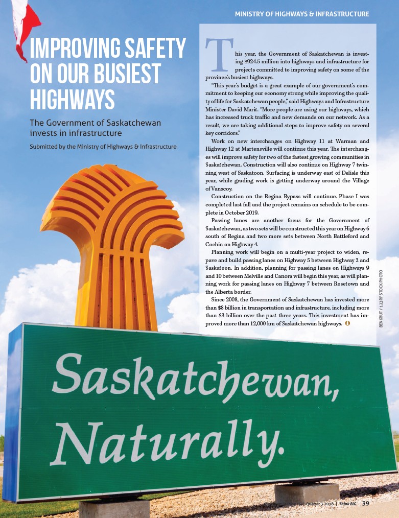 of life for Saskatchewan people,” said Highways and Infrastructure